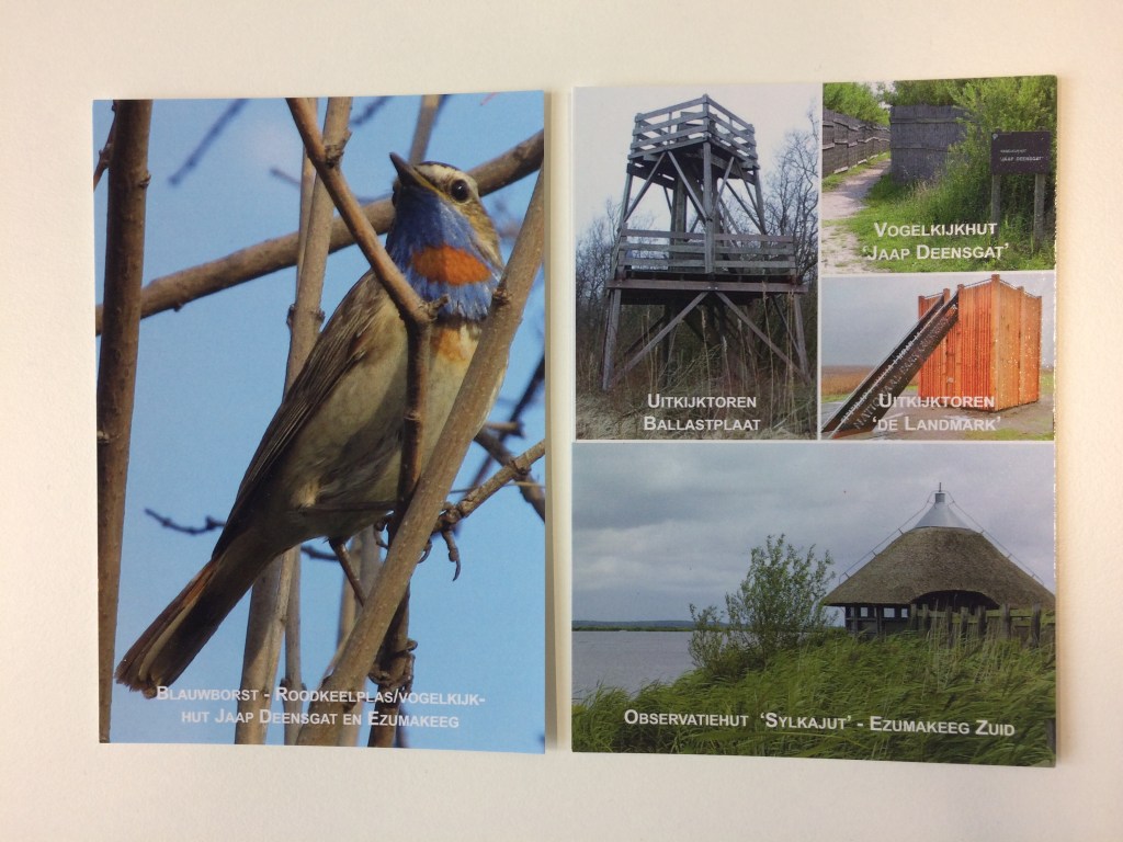 The first postcard, showing a bluethroat (Luscinia svecica) mentions three different spots in which the species can be found, but the site in which the photograph was taken is unknown. A mild disorientation results from the ambiguity surrounding the depicted scene. The divide between the postcard’s presented site-specificity and the remove that exists between the recipient and the environment depicted is even more obvious in the fourth postcard, showing four bird hides around Lauwersmeer. The places depicted here do not so much show the particular sights of the destination Lauwersmeer, as they show spaces designed to experience this environment from. The top right photo, of “Jaap Deensgat” does not even show the bird hide but a sign announcing it. The bottom photo, of “Sylkajut” shows a hide that is no longer in existence – although it was closed for visitors due to Covid-19, it was devastated by a fire in April 2020.