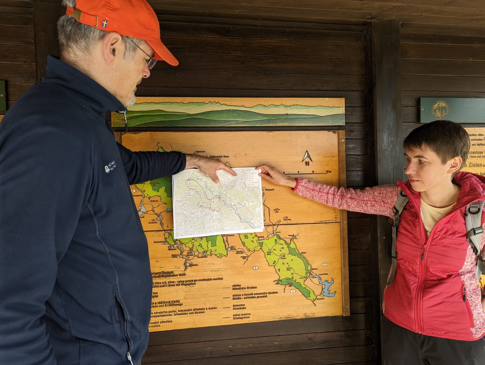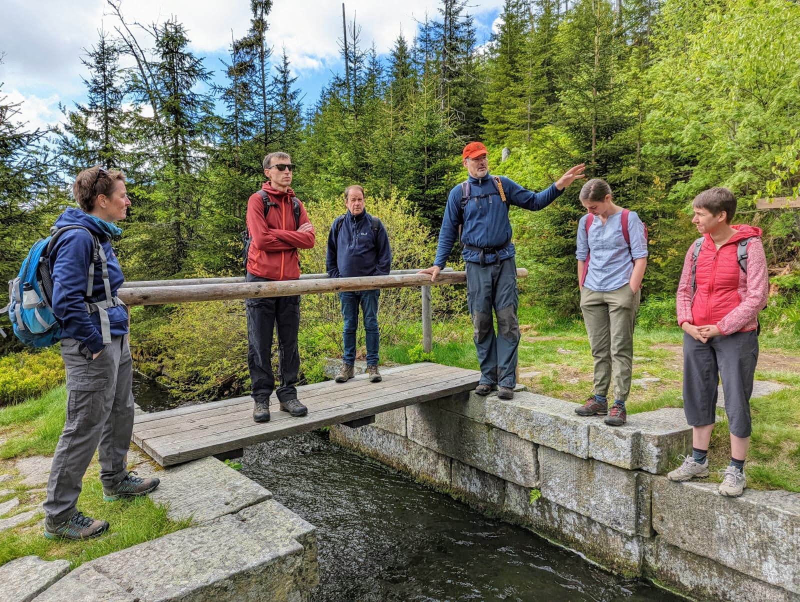 ‘Complexity’, then, is probably the most appropriate term to describe the two parks as well as their relationship to each other, and the best way of grasping this complexity is to see or, even better, walk the parks for oneself. It was therefore fitting that the second of our Corridor Talk excursions, in late May this year (2022), should take place in the border zone of BFNP/Šumava, an area crisscrossed by boundaries (not all of them visible) of different kinds. The Corridor Talk team, composed as it is of geographers, historians, and literary/cultural scholars, might seem well equipped to negotiate this multivariate terrain. But I think it’s safe to say that all of us discovered, albeit in different ways (and I freely confess here to my physical as well as intellectual unfitness), that it’s one thing to cover the ground, but quite another to be able to grasp its geographical and historical details: walking in these particular parks is more – a great deal more – than just a walk in the park.